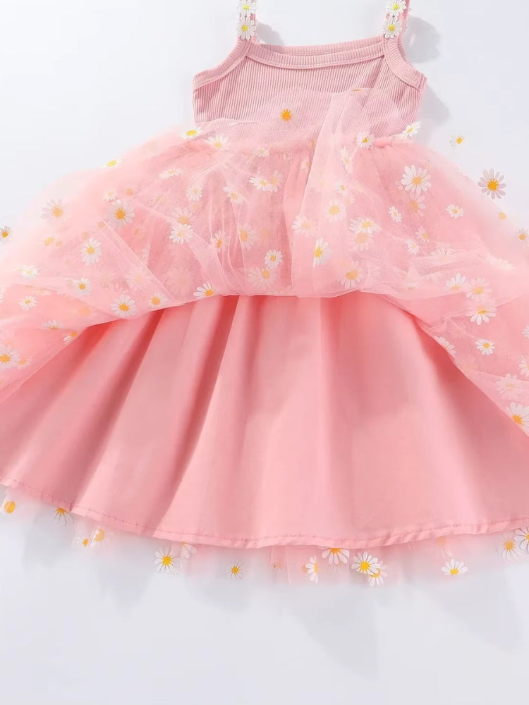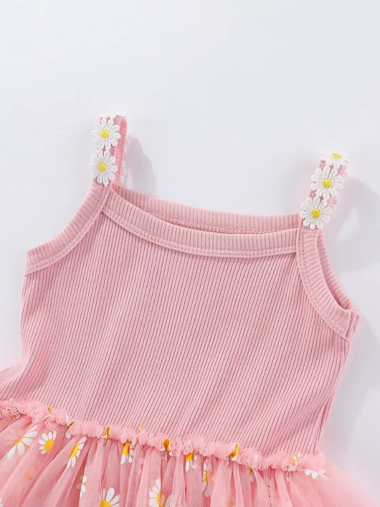 Plus qu'une simple robe, c'est une invitation à célébrer les beaux jours. Le haut côtelé assure un ajustement parfait, tandis que les bretelles fleuries ajoutent une touche de gaieté. La jupe en tulle, magnifiquement ornée de motifs marguerites, vole la vedette et flotte gracieusement à chaque pas de votre petite princesse.